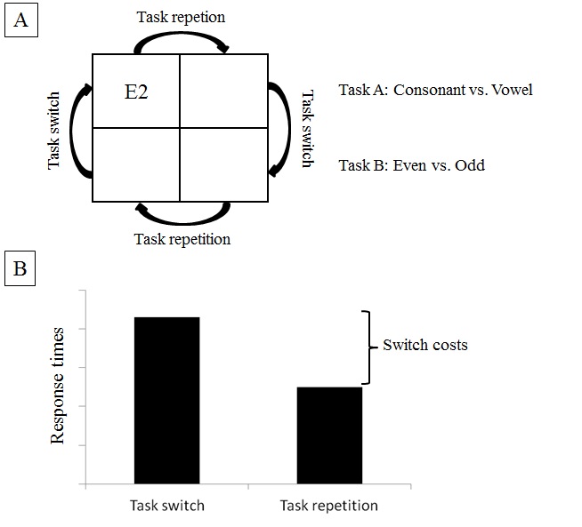 Figure 1. Panel (A): Illustration of stimuli (i.e., number-letter pairs) in the context of the task switching paradigm (Rogers & Monsell, 1995). Number-letter pairs are sequentially presented, rotating clock-wise from box to box (arrows illustrate this rotation). Participants are illustrated to manually respond to numbers (number task: even number vs. odd number) or letters (letter task: consonant vs. vowel) when pairs are presented in the upper two boxes and lower two boxes, respectively. This way of task instruction results in situations with task repetitions and task switches. Panel (B): additional demands on executive functions in situations with task switches typically result in higher response times in contrast to these times in situations with task repetitions. This difference is referred to as switch costs.