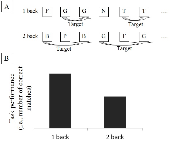 Figure 3. Panel (A): Illustration of the n-back paradigm (as realized in Colzato et al., 2013). In the context of this paradigm, participants are instructed to compare the current element of a sequence (e.g., a sequence with different letters) with the element n steps back (e.g., one, two or three steps). In case of a match (i.e., identical elements) they are instructed to give manual key press responses. The level of n determines the complexity level of the n-back situation and therefore the demand on the updating function. Panel (B): Typically, task performance (i.e., number of correct matches) decreases with the n level (e.g., decrease from n = 1 [1 back] to n = 2 [2 back]).