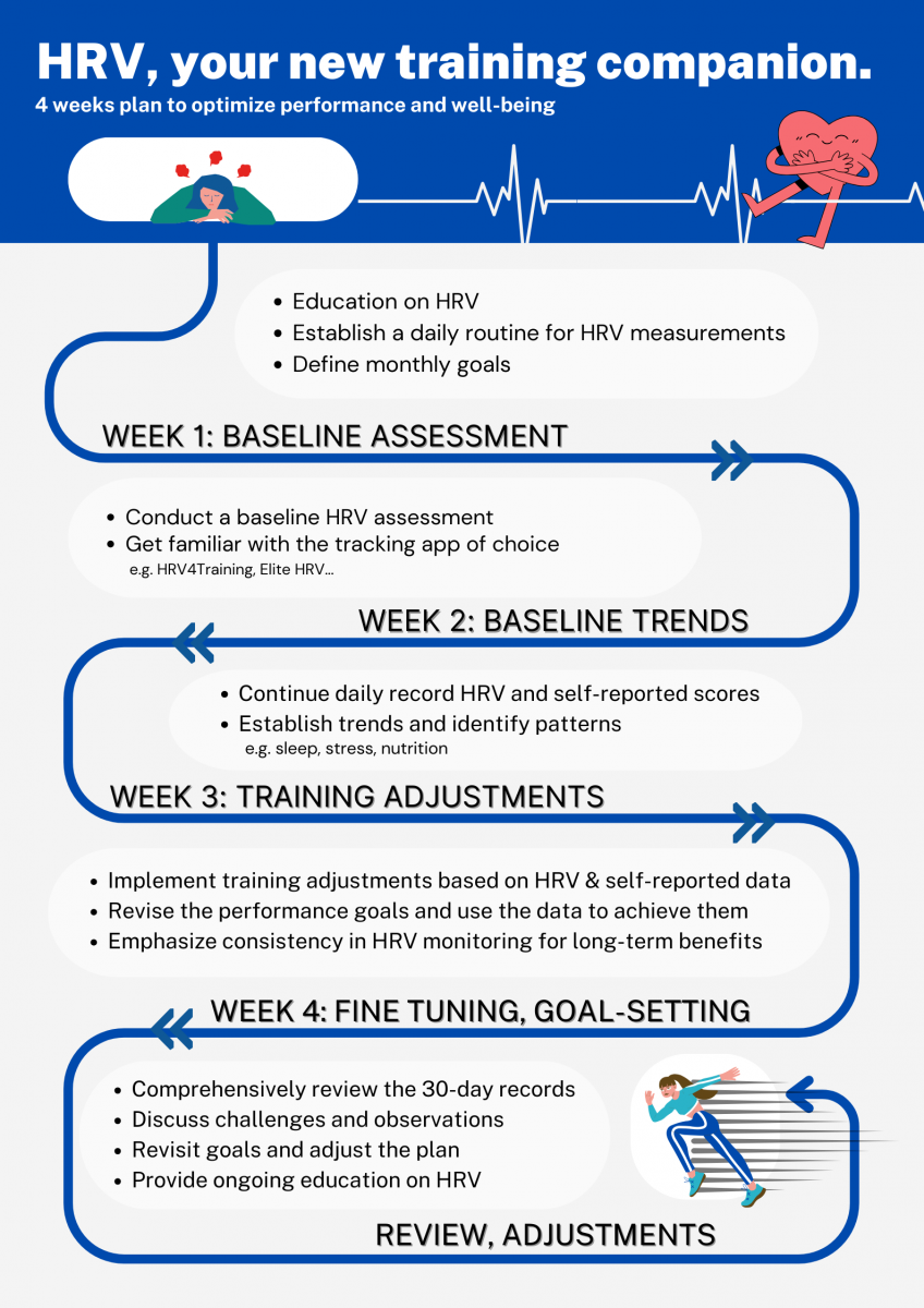 Image 5b: Details of the 4 weeks HRV challengeSPB is an easy and affordable way to quickly improve your HRV, and apps like HRV4Biofeedback, iBreathe, or Awesome Breathing make it even easier to practice. While the average adult breathes 12-20 times per minute, SPB involves breathing about six times per minute to actively boost your HRV. This method helps reduce anxiety and increase calmness and resilience, which is perfect for managing stress right before a competition or in your daily life [12]. Regularly incorporating SPB into your training can also lead to lasting benefits, such as improved sleep quality for Olympic athletes [8].