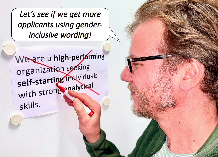 - Organizations can also adjust linguistic forms and pictures in recruitment advertisements. Women indicate higher application intentions for traditionally masculine fields (e.g., entrepreneurship) when recruitment advertisements forego male-typed images and generic masculine word forms some languages offer (masculine linguistic form of "entrepreneur" used as a generic for men and women; e.g. German “Unternehmer”). Women’s application intentions can be enhanced if organizations use neutral or more female-typed images and gender-inclusive language forms (gender-fair word pair of feminine and masculine linguistic forms "entrepreneur, fem./entrepreneur, masc.", e.g. German “Unternehmerin/Unternehmer”)[44].