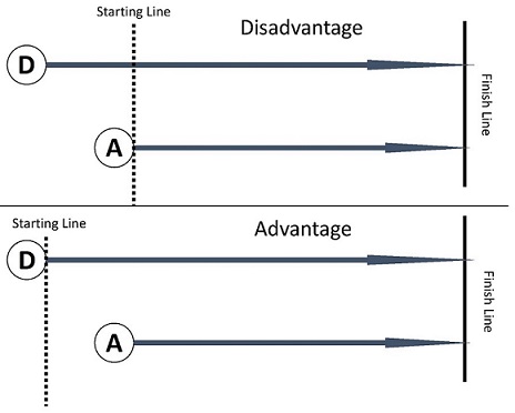 (Click to enlarge)Brian Lowery and Rosalind Chow use the following an analogy: Imagine two runners on a track, but one is behind the starting line and one is right at the line. The point at which there is equality (the starting line) is known, and it is clear that one person is behind. Here, the advantaged runner (A) is now simply where she should begin the race. That hardly sounds like privilege, right? What if we moved both runners forward such that the advantaged runner is ahead of the starting line and the disadvantage runner (D) is at the line? The disadvantaged runner is now where he should begin the race and the advantaged runner looks outright privileged.