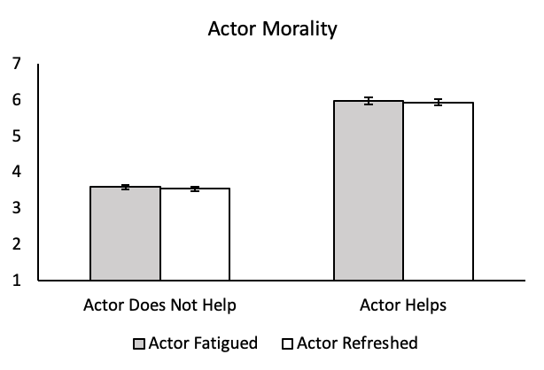 The results were clear: Participants rated helpful actors as more moral than unhelpful actors (as expected), but, critically, actor fatigue had no impact on morality ratings (Figure 1). The same pattern emerged for ratings of how much actors deserved help and how likely participants would be to help them. Despite participants recognizing that actors were exhausted, fatigue did not provide an excuse for unhelpful actors or earn helpful actors a moral bonus. It was actor deeds, not actor fatigue, that mattered for moral judgments. (Statistically savvy readers will note from the tiny error bars that the effect size for actor behavior was enormous, average ηp2 = .72, but the effect for actor fatigue was miniscule, average ηp2 = .01.)
