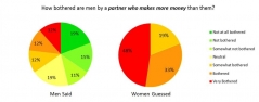 Surprised? You are not alone. We also asked men to guess how women responded and we asked women to guess how men responded. We found that both men and women statistically significantly overestimated how bothered the other gender would be by non-traditional gender-role incomes. The differences were drastic, with 52% of men and 81% of women believing that the opposite gender would be bothered/ very bothered by non-traditional gender-role incomes (see pie charts, click to enlarge).