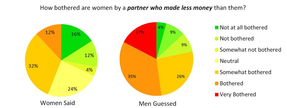 To answer this question, my colleagues and I conducted a survey with Midwestern undergraduate students in which we asked women how bothered they would be if their long-term romantic partner made less money than they did (Clerkin & Hong, in preparation; Sarma & Clerkin, 2013). The majority of women were not bothered, while 12% said they would be bothered. We also asked men how bothered they would be if their long-term romantic partner made more money than they did. The majority said they would not be bothered, and 24% reported they would be bothered/very bothered.